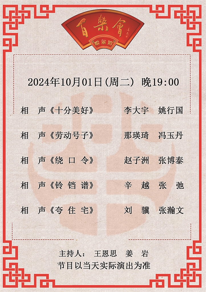 生活报讯 (实习生陈文洁 李仁雪 记者王晓晨) 日前,记者获悉,10月1日-7日每天19时,哈尔滨相声百乐会都准备了节目,观众可在节日期间“品尝”到由我省曲艺演员“烹制”的相声大餐。