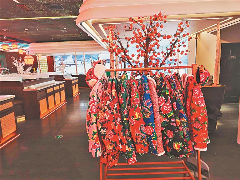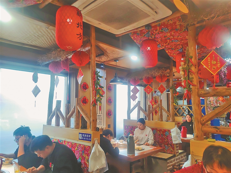 各色花布围墙、大蒜玉米土豆吊棚、服务员红袄绿裤穿一身……在走访中记者看到,人们印象中铁锅炖门店标配,而今年一切变了模样,一改土造型,变身高大上。