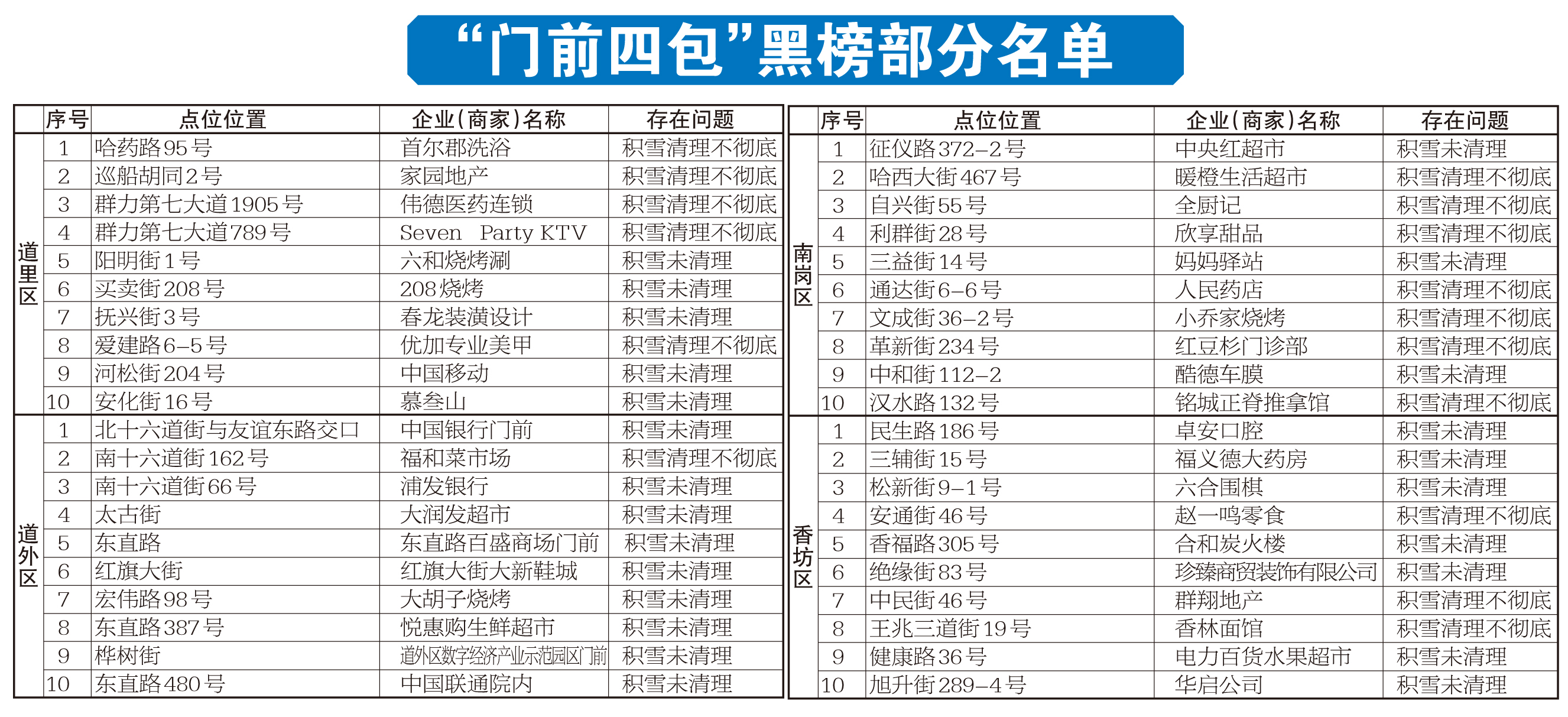 对此,哈市城管部门将本轮降雪后落实“门前四包”责任制的红黑榜向社会公示,对落实较好的临街单位和商户进行表彰,对存在问题的临街单位和商户进行“晾晒”。