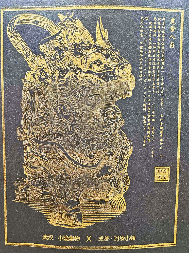目前,秦伟在武汉所覆盖的盖章点有四个景区,每一个景区都有不同的主题。“我们有500多个原创印章,还有不定期推出的特色印章。”这500多枚印章中,最让秦伟自豪的是尺寸为21×15厘米的文物印章——猛虎食人卣滚筒章。“我们当时就是想做一些文物印章宣传历史文化,后来想到了一些有意义的文物,最终选择了猛虎食人卣。”为了能够将印章制作得更加精良,秦伟带领团队日以继夜查询资料,制作了4个版本,每一版几乎都要进行两万笔以上的修改,“最终我们选择了现在这个版本,黑色卡纸做底,金色印泥呈现印稿,大气厚重。”该款印章一经推出,就受到了广大“章友”的喜爱。