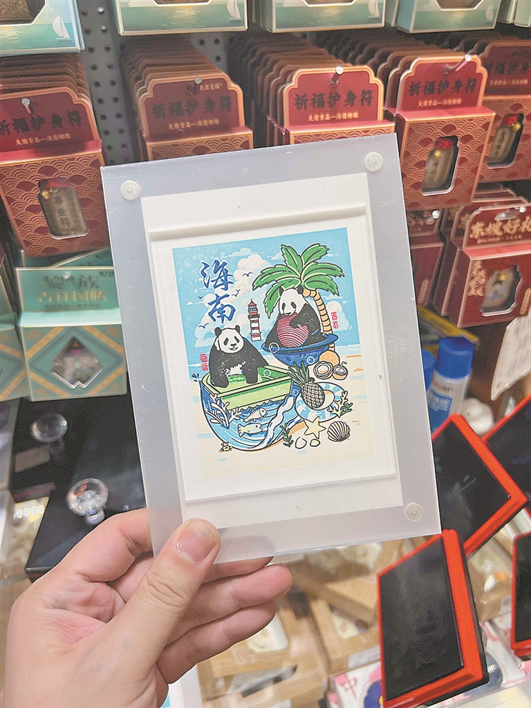 陈然告诉记者,他们最骄傲的印章是一套12色套色印章,该款印章以当地有名的萌仔熊猫IP“舜舜”“贡贡”为蓝本,装饰包含椰子树、游船、贝壳等海口元素。“12色套色是印章中套色较多的,制作时需要对着线稿绘画,线与线之间的距离需要精准到毫米,稍微差一点,成品就会出现模糊不清的情况。”本次活动中,陈然看到了来自全国各地的印章爱好者一起打卡、互相交流心得,即使一个印章从研发到初次制作要耗费20天,陈然也觉得很值得。