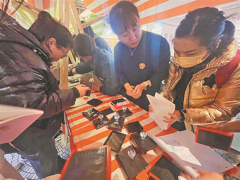 “昆明那个章我盖上了,好好看啊。你这个还有套色的,我也要去排队……”11月30日,在哈市道里区一家商场内,一场冰城南北印章文创交流市集如火如荼地开展。记者在采访中了解到,此次活动中,来自全国各地的31位文创主理人拿出了超400枚“看家美章”,免费向“章友”开放,同时还赠送精美明信片、冰箱贴、盖章本等好物。到场打卡的除了哈尔滨本地的“章友”外,还有来自大连、天津、湖南、上海、三亚等地近2000名爱好者。