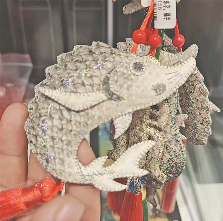 “这些工艺品都是纯手工缝制的,一个作品可能需要几十只不同种类的鱼皮。不同种类的鱼,鱼皮的颜色还不一样,明暗的区别会使立体感更加强烈。制作的时候要先将鱼皮完整地剥下来后,经过熟制工艺,再将鱼皮定到板子上,给它撑直,等它风干后,板皮就会非常平整。工匠师傅通过温度和湿度,控制板皮的软硬,等到软硬适中,就可以粘贴或缝合在一起了。就拿我们店里的鱼皮成衣来说,制作一套鱼皮服装至少要耗费大约半年的时间。”王店长说:“游客对我们的民族特色产品特别感兴趣,每次有人来店里,我还会和他们讲述赫哲族与鱼皮工艺背后的故事,希望通过这种方式,让更多的人能感受到黑龙江赫哲族鱼皮技艺的魅力,让他们的消费充满意义与价值。”