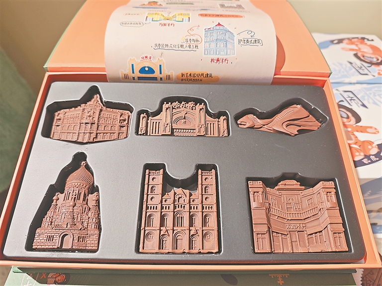 “我们店里纯手工制作的哈尔滨地标建筑巧克力极为抢手。”在中央大街一家糕点铺,褚店长表示,“每个礼盒定价168元,共有6块巧克力,都是哈尔滨的特色建筑,像大剧院、索菲亚教堂、万国洋行、哈站等,里面还贴心附赠了哈尔滨的旅游攻略图。”褚店长告诉记者,此款巧克力因为独特的构思和精美的造型,已成为店里的王牌产品,“现在店里它卖得最火,基本上都是游客买来做伴手礼。”