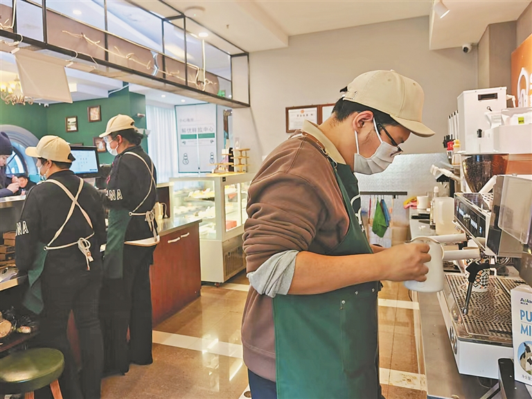 “您好,请问需要什么”“这是您的咖啡,请慢用”……虽然每天从早上九点营业后就要开启忙碌模式,但岳鹏飞和他的小伙伴们从不会被打乱阵脚。即便戴着口罩,游客们也能从他们的眼中感受到满满的热情。