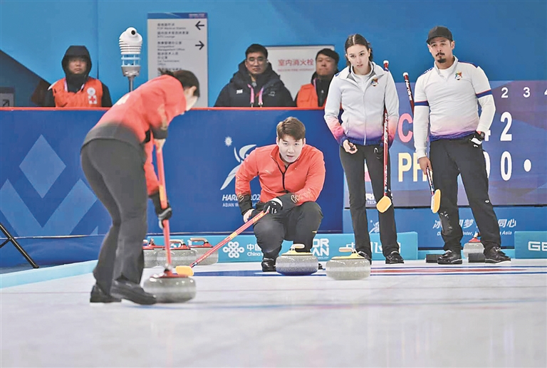 生活报讯 (龙头新闻记者王志强/文 张春雷/摄) 5日,在本届亚冬会冰壶混双循环赛中,中国队王智宇、韩雨组合一天双赛,力克吉尔吉斯斯坦队和菲律宾队,获得开赛以来的三连胜,为小组出线增加了砝码。
