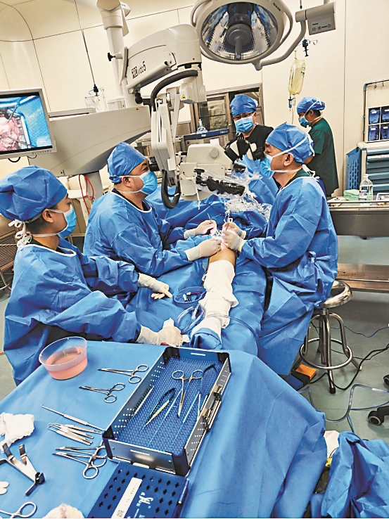 考虑到于某的情况,医生为其做了详细的检查。肌电图、彩超、CT,综合诊断患者的病情适合手术后,医生建议他尝试周围神经平衡术。这一手术方式是在显微镜下进行微创手术,切口在患者侧下肢,切口长度约3-5cm。