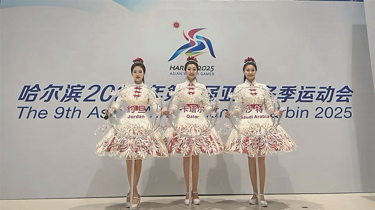来自哈尔滨石油学院三名学生——胡鹤然、宦春回、于诗阳,身着华服、步履从容,手举引导牌,引领韩国、菲律宾、土库曼斯坦代表团步入冰雪舞台。三位哈油姑娘用自信的微笑和优雅的姿态,向世界展现了哈油的青春风采,传递了中国青年开放包容的时代精神,更诠释了“冰雪同梦,亚洲同心”的开幕式主题。