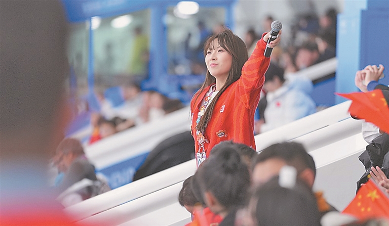 “乌蒙山连着山外山,月光洒下了响水滩……”郑心怡清澈且极具穿透力的歌声在第九届亚冬会速滑馆内悠悠回荡。原本还沉浸在赛事中的观众们,突然就被这美妙歌声所俘获。许多观众跟随着节拍轻轻摇摆身体,小朋友们更是兴奋地舞动着手中的国旗,大声跟唱。