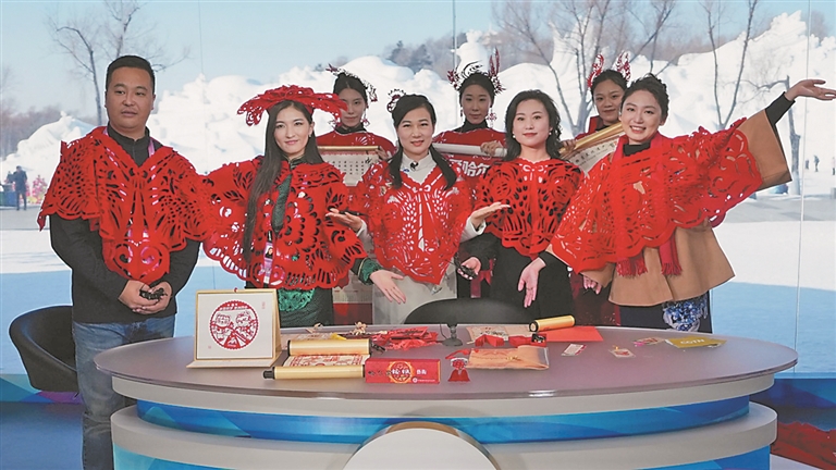 在园区的总台冰雪演播室同样热闹非凡,非遗糖人制作者受邀做客直播间,为大家现场制作糖人。制作老师先将熬好的糖稀舀起,轻轻一甩,糖稀便划出一道优美的弧线,落在案板上。随后,老师用小勺子迅速勾勒出索菲亚教堂的形状,不一会儿,一个栩栩如生的糖人就诞生了,引得观众纷纷点赞。随后,我省方正县剪纸非遗传承人曲英红带着她的团队,展示了中国国家级非遗“方正剪纸”的精美图案,体现了浓郁的中国风与这项非物质文化遗产的奇妙魅力。麦秆剪贴技艺国家级非遗传承人马文侠团队的作品被选为国礼,送给来华出席哈尔滨亚冬会开幕式的国际贵宾,这份“国礼作品”也在演播室中亮相。