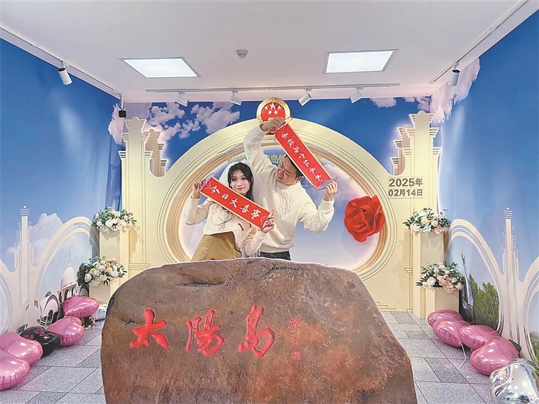 14日一早,太阳岛婚姻登记处就迎来了排队等待办理结婚登记的新人,工作人员热情地引导,耐心解答每一个问题,每一个流程都有条不紊地进行。拿到结婚证的那一刻,新人们的眼中闪烁着激动与喜悦的光芒。在婚姻登记处精心布置的拍照区域,新人们留下了人生中最幸福的影像。有的新人手捧鲜花,与结婚证一起合影;有的新人甜蜜相拥,在粉色气球和温馨灯光的映衬下,定格这珍贵瞬间。随后,新人们庄重地宣读爱情誓言。他们的声音坚定而深情,一句句誓言回荡在婚姻登记处,传达着对彼此的承诺与爱意。