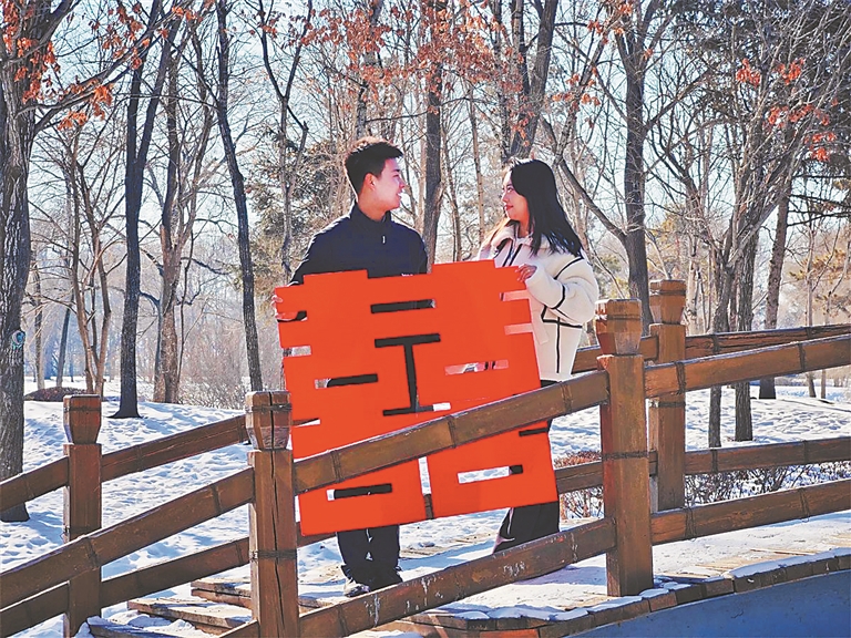 生活报讯 (记者王伟健 李岚) 2月14日,哈尔滨太阳岛婚姻登记处一片热闹、喜庆的景象,30对新人来此登记结婚,并在室外多处“爱情打卡点”拍照留念,记录属于他们的幸福时刻。