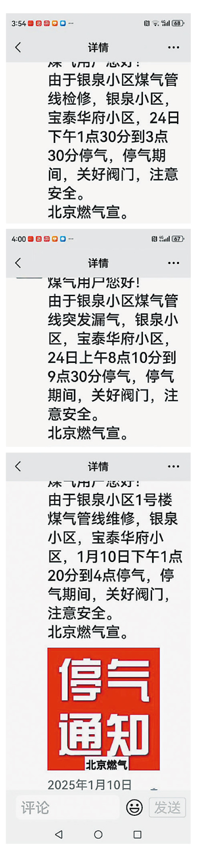 “多数情况下,只要不是临时抢修都发通知了,但还是不方便啊,一停就是大半天,希望尽快解决这个问题。”居民们表示,偶尔停气他们能够理解,但近半年来小区停气的频率让大家有些受不了。“我们把最近半年多的停气通知都列成了表格,时间和原因全都有。”记者在居民们提供的停气表中看到,从2024年7月23日至2025年2月4日半年多的时间里,该小区的停气次数达到了15次。