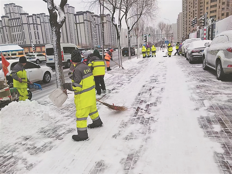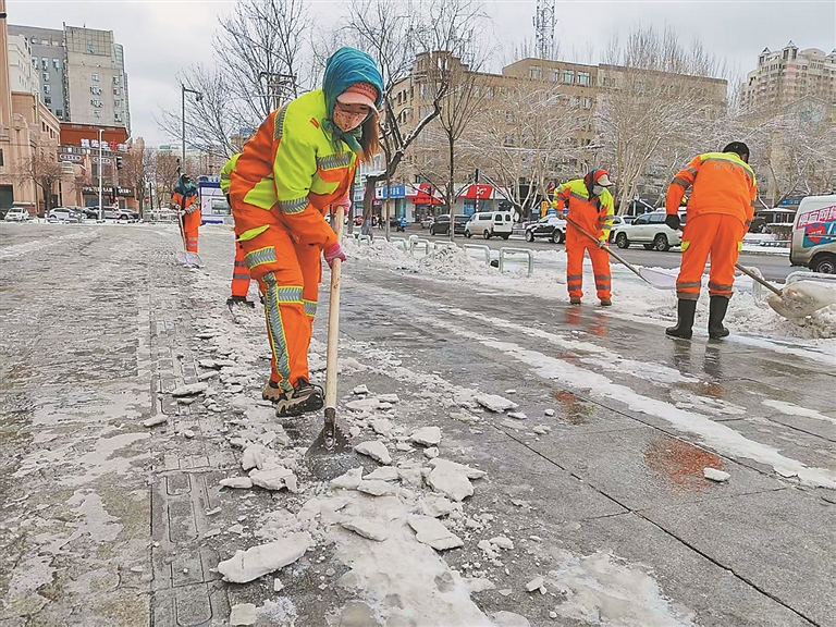 27日清晨,在香坊区三大动力路上,环卫工人们在路边排成梯队作业,对积雪进行清理,他们从夜间一直奋战到早晨。道里区的清雪大军人机结合、全力攻坚,做到清雪迅速、破冰坚决、拉运及时。截至27日12时,共拉运积雪300余车,重要景点、商圈周边及主干街路全线清理完毕,次干街路及背街正在有序推进。