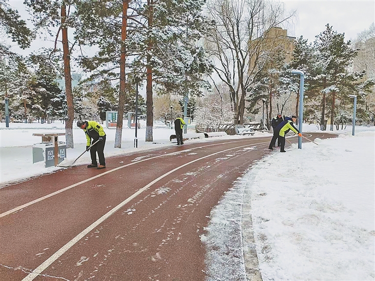 在此次清雪行动中,哈市园林部门将公园主干道、台阶、广场等区域作为重点清理对象。采用机械大清扫与人工细化作业相结合的方式,力求做到“清根见底”。针对容易积水区域,及时进行排水疏通,有效防止二次结冰,避免在冻融期间园路和广场积雪结冰造成安全隐患。