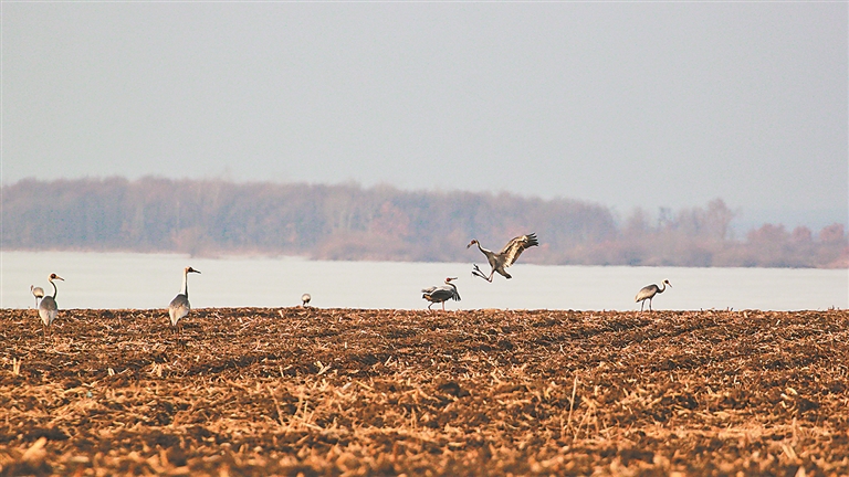 据了解,索伦农场和方山林场交界处拥有丰富的水资源,树林、田野和湿地交织,为候鸟提供了充足的食物。只见在田地里的白枕鹤或休闲觅食或嬉戏玩耍,时而飞翔、时而引吭高歌,十分惬意。“它们早已熟悉了这里的环境,丝毫没有陌生和恐惧。”一位摄影爱好者说。
