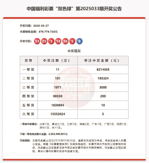 27日,双色球第2025033期开奖,本期一等奖开出11注,具体中奖情况:北京1注、黑龙江1注、江苏3注、湖南2注、广东1注、广西1注、陕西1注、深圳1注。奖池金额20.23亿元,本期销量3.79亿元,筹集公益金1.36亿元。