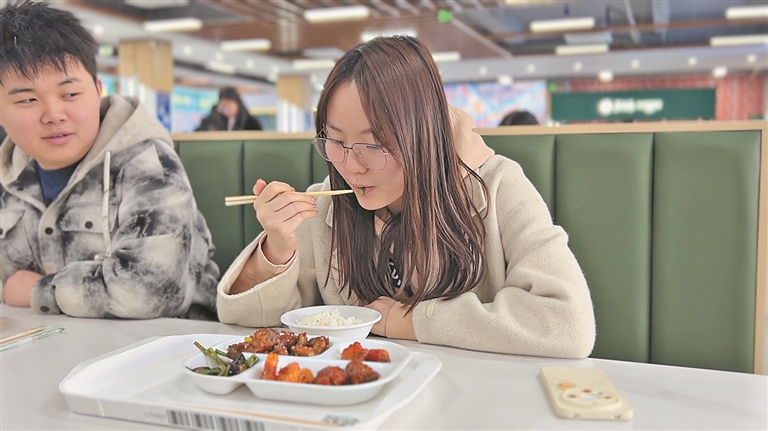 在餐厅的角落,孙同学和男朋友正在分享一份软炸龙利鱼。“刷脸支付真的超方便!”李同学说,“以前中午高峰期排队刷卡,经常找不到校园卡,现在往摄像头前一站就支付完成了。最让我惊喜的是营养分析功能,以前吃饭全凭喜好,现在取餐时屏幕上会显示碳水含量多少,非常适合减脂的女生。”