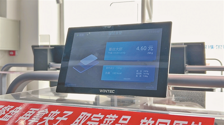 记者注意到,餐厅里最引人注目的就是那一排排智能称重餐台。与传统食堂固定分量的打菜方式不同,这里每个菜品都放在装有精密传感器的餐盆中。“学生可以根据自己的食量自由取用,智能屏幕上会精确显示每100克菜中所含的热量、碳水、蛋白质和脂肪的含量。”