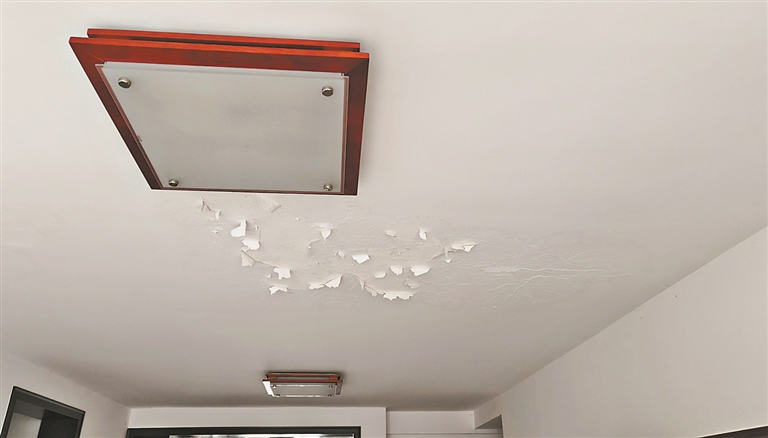 王女士家住松北区学苑小区3号楼6楼,近几年屋里出现了返潮、墙皮脱落的情况,最近她又发现家中有墙体漏水。3月27日,记者在王女士家看到,厨房、卧室、卫生间棚顶部分白色墙皮裂缝脱落,窗边的白色墙皮也有水迹,有的露出了灰色的水泥墙面。
