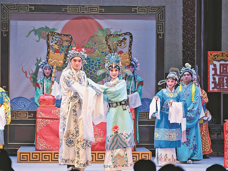 演出现场,“花派”再传弟子田玉丽塑造了一个丹心报国、不畏强权的女巡按形象。她的嗓音清亮圆润,既有“花派”标志性的高亢流畅、华丽清新,又融入了刚毅豪迈的表演风格,将谢瑶环怒斥奸佞的凛然正气演绎得惟妙惟肖、入木三分,令观众时而潸然泪下,时而热血沸腾,掌声叫好声在剧场此起彼伏。
