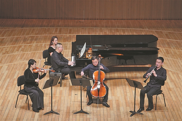 中场休息前,沃尔特·拉布尔《四重奏》成为最大亮点。方弋领衔的钢琴、单簧管、小提琴、大提琴四重奏组合,以丝绸般顺滑的声部交织,完美呈现了维也纳乐派的精致典雅,第二乐章华彩段落引发热烈掌声。
