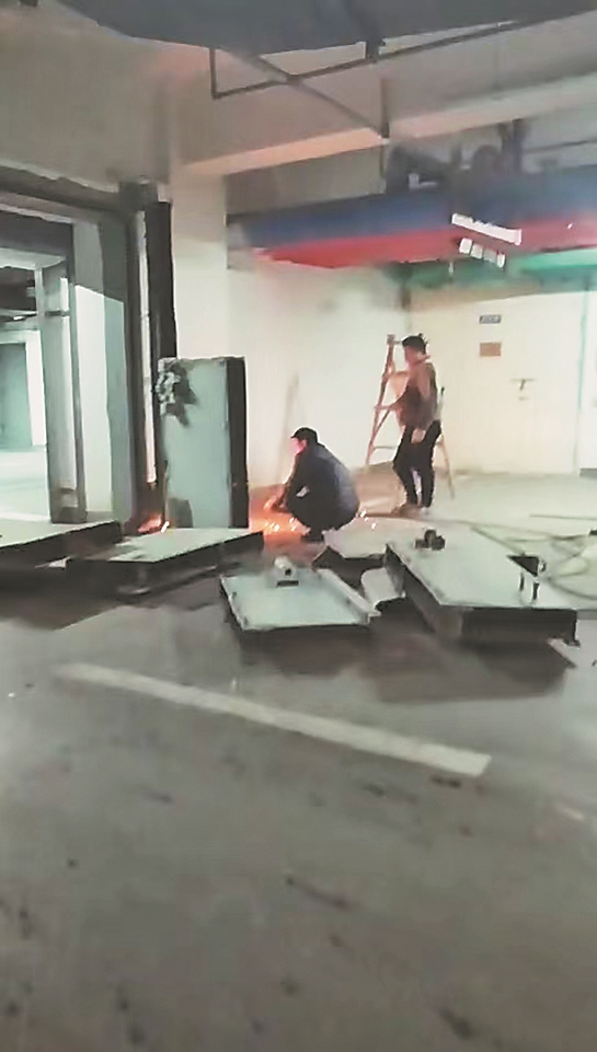 该小区一位业主告诉记者,地下车位A区和C区之间有两扇大门,有一人多高,宽一米半左右,门板足有10厘米厚,平时都是敞开的。6日是休息日,一伙人用工具把这个厚重的铁门切割掉了,“人防门是保护人员和设施免受战时或灾害性事件影响的重要防护设备,业主们建议及时恢复这两扇大铁门。”一位业主提供的视频显示,几名身穿制服的工人正在施工,先是拆解铁门,而后是切割螺丝,火星四起。