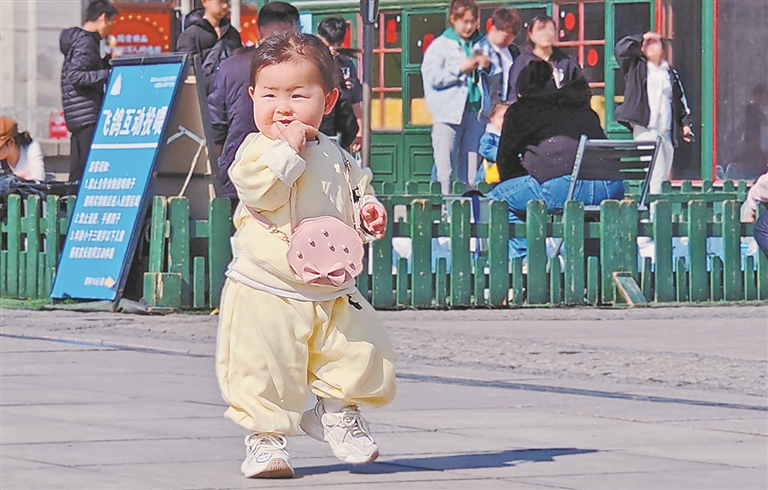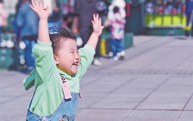 9日,哈尔滨开启“春日暖阳模式”,许多家长带着孩子来到户外享受春日阳光。在哈尔滨索菲亚广场上,孩子们在阳光下开心地嬉戏玩耍。