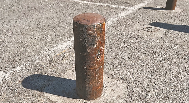 9日上午,记者来到现场看到,停车场西南方向一排停车位后方立有4根高约50厘米、直径约15厘米的铁柱,表面已锈迹斑斑,部分铁柱上面还有撞痕和被剐蹭的车漆。记者注意到,附近还有20余处割断铁柱后剩下的水泥基座,根部已磨得圆润发亮。