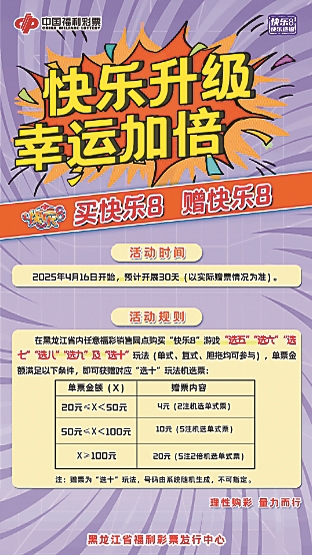 生活报讯 (记者李丹) 春风送暖,福彩相伴。值此春暖花开之际,黑龙江省福利彩票发行中心将于2025年4月16日盛大启动“快乐8”游戏春日赠票活动。本次活动共计发放总额100万元的“快乐8”游戏赠票,以此回馈广大购彩者的持续支持与深厚热爱。