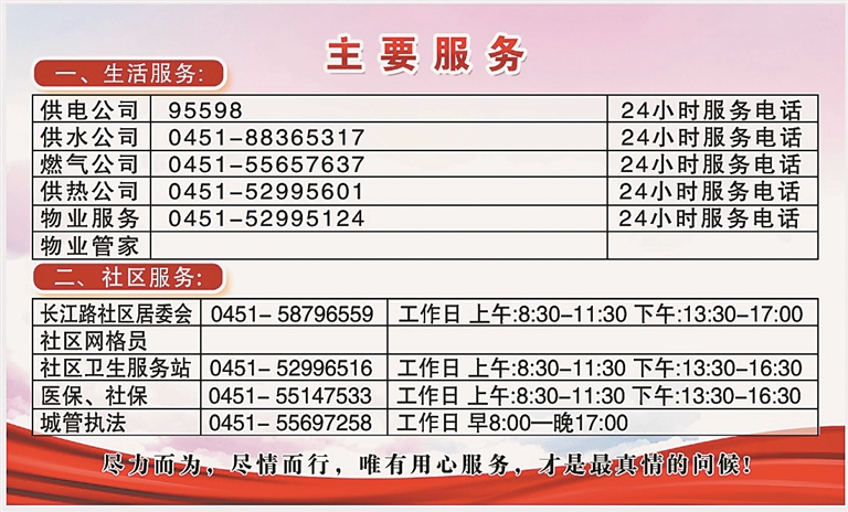 生活报讯 (记者于海霞) “社区给的‘便民服务明白卡’太实用了,以后有什么问题需要咨询,或是有困难需要帮助,打个电话就行了。”日前,哈市香坊区新香坊街道会展社区的居民刘大娘赞许道。
