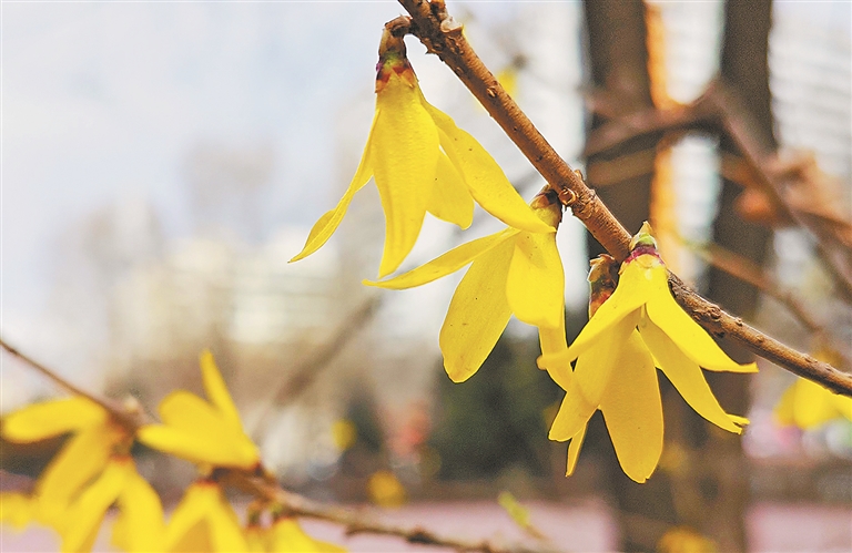 生活报讯 (记者李丹 李楠 牛婷婷 丁毅 文/摄) 迟日江山丽,春风花草香。近日,随着气温逐渐回暖,哈尔滨街头巷尾各色春花竞相绽放,为城市披上了绚丽的春装。14日,记者在走访哈市的一些庭院、街心街角、公园时发现,东北连翘、京桃花相继亮相,山杏花也含苞待放,冰城即将迎来一年一度的春花观赏盛宴。