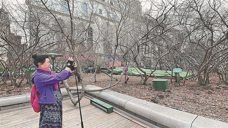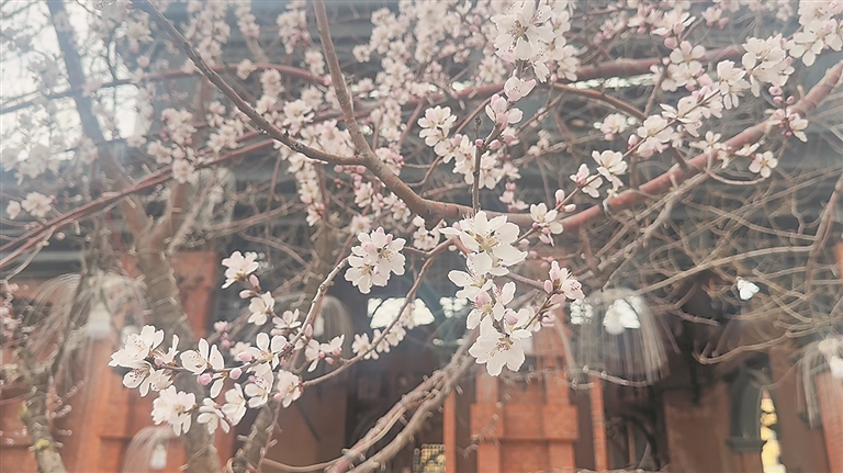 在文化家园北门,几株桃树已悄然绽放,粉白相间的花朵缀满枝头,微风拂过,花瓣轻轻摇曳,吸引了不少市民驻足观赏。“每年春天,我都会来这里看桃花,感觉特别有生机。”市民张女士一边拍照一边说。