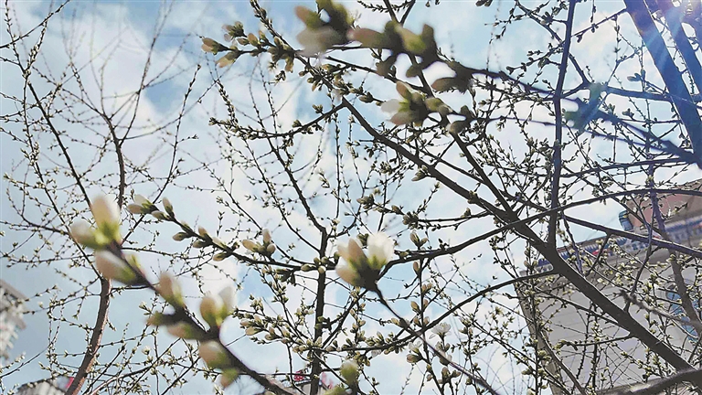 与此同时,山杏花也不甘示弱,在哈平路、兆麟街等地,树枝上已密密地鼓起了花骨朵,一个个圆润饱满,像是即将破茧而出的精灵。其中,个别的小花苞已悄然绽放,露出洁白或淡粉色的花瓣,在嫩绿的叶芽衬托下,显得格外清新淡雅。“杏花疏影里,吹笛到天明”,山杏是蔷薇科杏属植物,其花朵先叶开放,花瓣白色或稍带红晕 ,给人一种纯洁、质朴的美感。