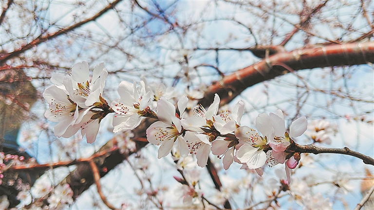 紧接着,京桃花也盛装登场,为冰城再添一抹浪漫。在索菲亚广场周边,高大的京桃树上,粉色、白色的花朵一团团、一簇簇,远看像天边的云霞,近看每片花瓣薄如蝉翼,在阳光的照耀下闪烁着柔和的光芒,美得令人心醉。不少市民特意来到这里,与京桃花合影打卡,孩子们在花丛旁嬉笑玩耍,年轻人拿着相机捕捉这美好的瞬间,老人们坐在长椅上悠然欣赏,感受着春日的惬意。
