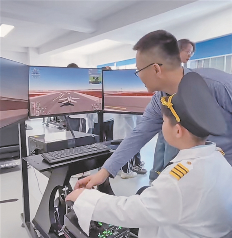模拟开飞机老师张浩宇向记者介绍,同学们现在模拟开的飞机都是通过卫星实时传输,比如学生选择的北京大兴国际机场,模拟开飞机的大屏上就会显示北京实时的天气情况,与真飞机场的情景是一致的。“左手推油门,右手将操作杆轻轻垂直向后拉开……”在老师的细心指导下,每名同学都把飞机开到空中。有的同学操控过快,把飞机开得上下翻飞,有的甚至在模拟机上“坠毁”,现场不时传出孩子们开心的笑声。