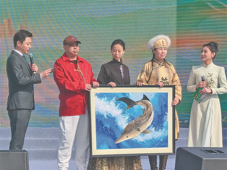 整场活动持续了40多分钟,除了开江民俗展示、诗朗诵,还有三位非遗传承人登上舞台,首次展示用“桦树皮画”“鱼皮画”“麦秸画”非遗技艺共创的作品《非遗塑鲟鳇》,展现了松花江流域人与自然和谐共生的美好景象。百人合唱的原创主题曲《大开江》作为收尾节目,更是大气磅礴,将“春水盛景 一江欢歌”的氛围烘托到了极致。