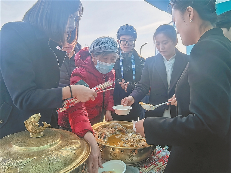 除了精彩的节目,当天吸引大家来“打卡”的另一个亮点就是品“开江鱼鲜”!“其实很多人都不知道,东北有一种非常好吃的美食,那就是开江鱼。吃开江鱼的时段特别短,每年就十几天,我特别想告诉南方朋友,哈尔滨不仅冬天有冰雪、夏天享清凉,春天还有美味的开江鱼。而且,我们东北的鱼类品种有很多,做法也很多,比如在活动现场,有炖鱼、有鱼汤、有鱼丸,都老香啦!我太喜欢开江活动的热闹氛围了!”市民米女士说。免费品尝队伍每个都排出几十米。