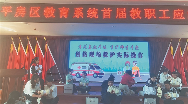 生活报讯 (记者吕晓艳 文/摄) 16日,由哈市平房区教育局、区应急局、区红十字会联合举办的“掌握急救本领 守护师生平安”平房区教育系统首届教职工应急救护大赛正在紧张进行中。老师们现场进行心肺复苏、创伤救护演练比赛。据悉,心肺复苏、创伤救护演练比赛在平房区尚属首次,区中小学生急救教育宣讲同时启动。