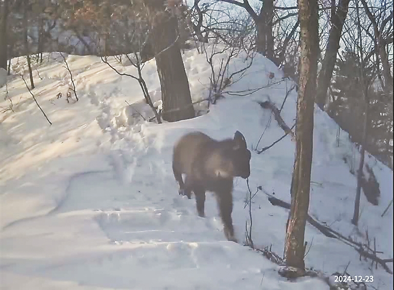 “长尾斑羚的两段视频时长20秒。”据黑龙江省野生动物研究所钟立成团队介绍,在冬寒料峭的山脊上,一只长尾斑羚踏着白雪,悠然自得地四处觅食,它体态饱满,呆萌可爱。这是一只成年长尾斑羚,仅分布在我国东北地区,是牛科偶蹄目斑羚属的一种高山动物,别名青羊。长尾斑羚是国家二级重点保护野生动物,被列为濒危物种红皮书易危物种,这是去年12月23日拍摄到的,也是近15年来哈尔滨地区首次捕捉到的野生斑羚实体影像。