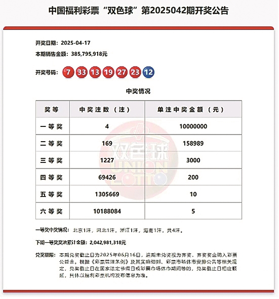 双色球第2025042期,4月17日开奖,开奖号码为7 33 13 19 27 23+12。一等奖中出4注,分别来自北京(1注)、河北(1注)、浙江(1注)、海南(1注)。奖池金额20.42亿元,本期销量3.85亿元,筹集公益金1.38亿元。