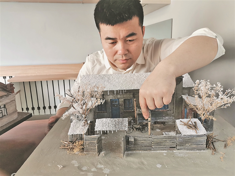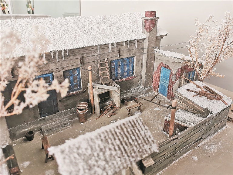 在王金川的工作台上,“废品逆袭”每天都在上演。他制作的《人世间》中周秉昆家的哈尔滨“光字片儿”老院,墙体是由泡沫板雕刻而成,瓦盖用纸壳揭去表层后做出波浪纹路,窗户的玻璃来自透明书皮,冰溜子则是用矿泉水瓶底一点点打磨出来的,院子里随意摆放的板凳、碗架子,是由冰棍杆、铁丝等材料拼接而成的。