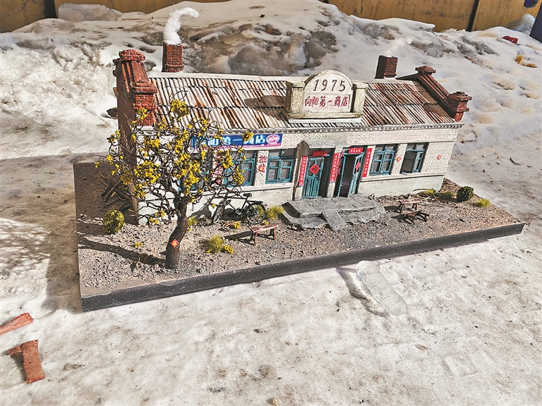 王金川是巴彦人,如今在黑河经营一家广告公司。工作之余,他把时间都用来制作微缩模型:用易拉罐做瓦片、拿纸壳做房盖、靠冰棍杆拼成板杖子、用泡沫板刻出砖墙的纹理。这些别人随手丢弃的废品,却在他的手中变成了黑河“老三百”商店、向阳小铺、王肃电影院等建筑模型。每个作品从搜集资料到完成至少需要一个月,期间还要反复调整细节,直到完全还原记忆中的模样。