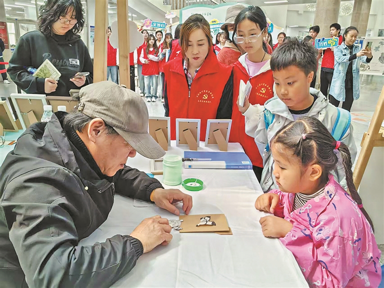 活动现场,体验项目更是丰富多样,“缤纷非遗”文化活动堪称亮点。黑陶、剪纸、芦苇画三项非遗体验,让读者们全情投入。从最初的生疏到逐渐熟练,大家不仅收获了亲手创作的喜悦,更深刻体会到匠人传承传统技艺的执着与坚守。其中,8岁的李可欣在非遗老师的悉心指导下,完成了一幅生肖蛇的芦苇画。她高高举起画作,眼中闪烁着光芒,“我妈妈属蛇,我要把这份礼物送给她!”这份充满爱意的作品,承载着对传统文化的传承,也传递着浓浓的亲情。