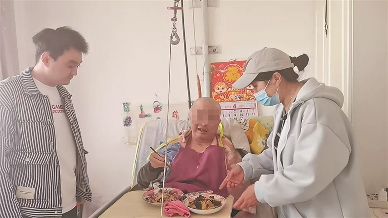17日,北安残联康复股科员国松和瑜璟养老护理中心工作人员一起来到残疾人老李家中,为他做了一顿热乎可口的饭菜。“今天上午老李按下了智能手环,接通后,他告诉工作人员,今天家里只有他和年迈的母亲,午餐没有办法解决,希望工作人员能上门帮他们做一顿午饭。”国松说,了解老李的需求后,他与养老护理中心工作人员一起前往老李家。养老护理中心工作人员仅用10分钟左右,就买齐了适合老人和残疾人的食材,并来到了老李家。老李躺在床上,正在努力支起床边的铁架子,“老李是肢体残疾,他平日里就靠床边的铁架子来活动,平时会有家里人给他送饭,今天家里人有事,他就寻求了我们的帮助。”国松介绍,养老护理中心工作人员进入老李家后,一边熟练操作,一边和老李及其母亲聊着家常,不一会儿,两个家常菜就做好了,老李在工作人员的帮助下坐在床上用餐。