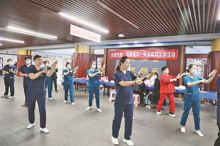 义诊当天,风湿病科学术带头人李泽光教授带领医护骨干,为参加活动的市民提供健康义诊咨询服务。医生们详细了解患者病情,耐心解答疑问,并对个体情况制定合理的诊疗方案。通过讲解与交流,帮助患者深入了解自身病情,掌握疾病管理知识,缓解紧张焦虑情绪,并对痛风患者的饮食、用药及肥胖管理进行一对一指导。活动现场还为前来参加义诊的群众免费提供中药穴位贴敷、耳穴压豆等中医特色疗法体验,并带领患者练习中华经络强身棒击操。