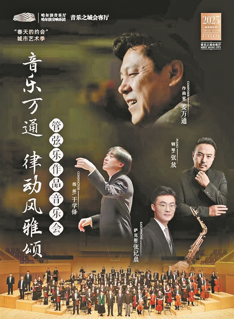 “春天的约会”城市艺术季——“音乐万通 律动风雅颂”管弦乐作品音乐会将于5月1日19时在哈尔滨音乐厅奏响。音乐会上将演奏作曲家姜万通的多部经典作品,哈尔滨交响乐团副团长、常任指挥于学锋执棒,留美萨克斯管演奏博士张记晨,钢琴家、雅马哈艺术家张放倾情加盟。管弦乐《庆典序曲》《鸿雁主题随想曲》、萨克斯管协奏曲《西北谣》等多部作品将一一呈现,为观众带来一场音乐的饕餮盛宴。