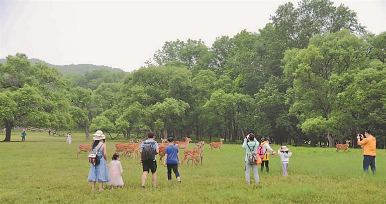 这里,千鹿同林。全国超大的半野生半散放式养鹿场,1000多头梅花鹿在山林草地间自由穿梭。5月,它们更加活跃。拿上胡萝卜条、玉米粒儿,小鹿就会亲昵地凑过来,超治愈。