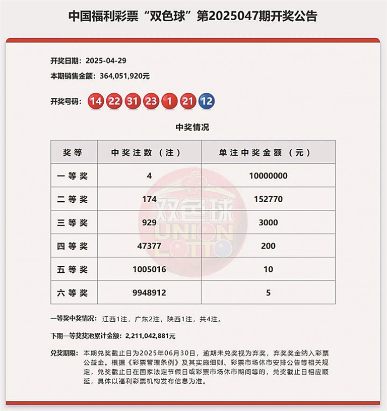 4月29日,双色球第2025047期开奖。一等奖中出4注,江西(1注)、广东(2注)、陕西(1注),奖池金额22.11亿元,本期销量3.64亿元,筹集公益金1.31亿元。