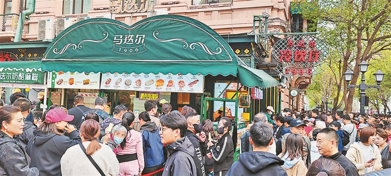 生活报讯 (记者李楠 牛婷婷 文/摄) “五一”假期的哈尔滨中央大街,人潮如织。百年老字号马迭尔冷饮厅前,购买冰棍的游客排起十几米的长队,成为中央大街的一道风景。从清晨到深夜,慕名而来的游客络绎不绝,只为尝一口“老哈埠”的经典味道。百年马迭尔不仅承载着几代人的记忆,更在文旅融合的创新探索中焕发出新的生机。